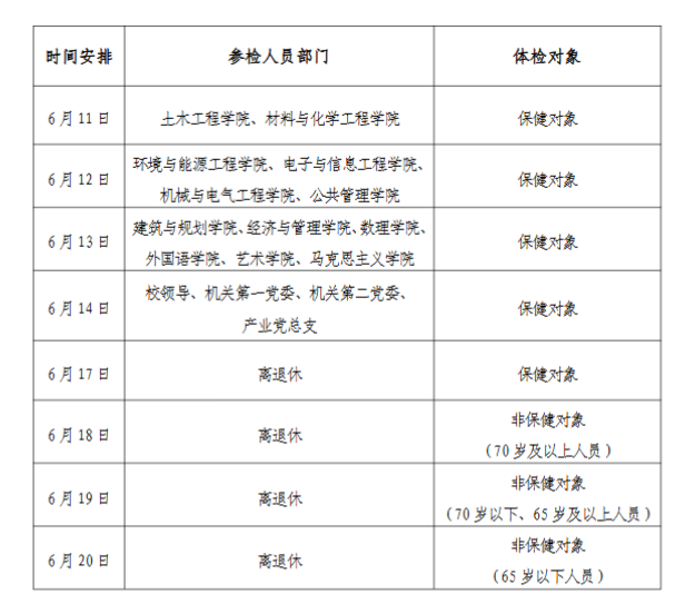 体检时间由学校统一安排,具体安排见下表: