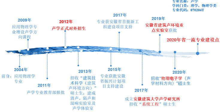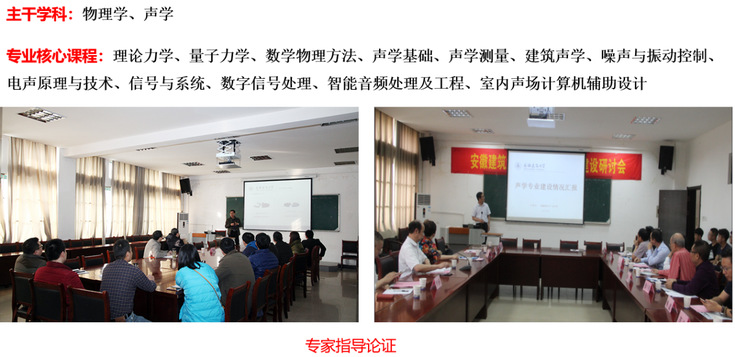 建有声学基础课程专业教学团队、声场感知与声环境设计技术科研团队。声学专业教师主持完成省级质量工程研究项目12项,主编教材2部,获安徽省教学成果奖5项;主持国家自然科学基金等省部级研究项目50余项,在国内外学术期刊及会议发表学术论文180余篇,编制国家建材行业标准2项、安徽省地方团体标准1项,获安徽省科学技术一等奖1项。注重科研反哺教学,培养学生贯通基础知识解决实际问题的能力。