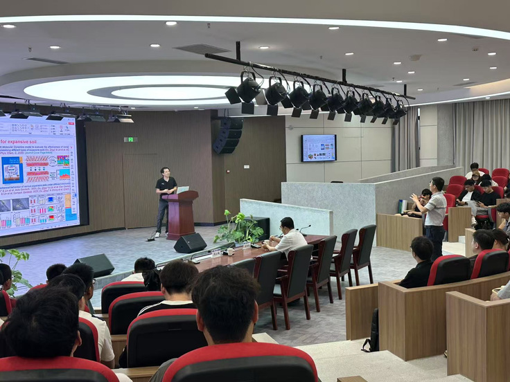 周安楠教授围绕非饱和土水力-力学耦合模型、实验验证、城市灾害模拟等方面展开阐述,结合自身团队在非饱和膨胀土、流体力学耦合及地质风险评估方面的成果,展示了模型在预测地下管道渗漏导致地面塌陷中的关键作用。周安楠教授的报告内容系统而前沿,师生们认真聆听、反响热烈。在互动环节,多位师生积极提问,如针对模型在真实工程中的适用性、非饱和土本构模型的优化方向等问题,周教授耐心解答,现场学术氛围活跃融洽。