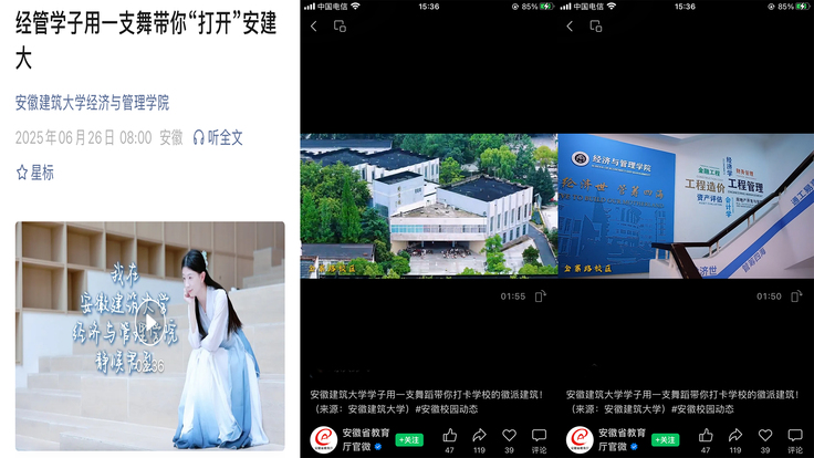 线上传播,创新形式展现特色。学院充分发挥新媒体平台优势,打造了一系列富有创意的招生宣传内容:微信公众号推出经管学子用一支舞带你'打开'安建大特色推文,以青春活力的形式展现校园生活,抖音平台参与学校招生线上咨询会直播,学院副院长章蓓蓓和学工办主任江琦通过实时互动解答考生疑问。