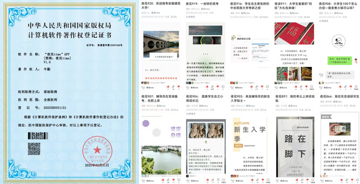 闻道有先后,术业有专攻。挂职锻炼是学习、是挑战、是重塑,学生工作则是专长、是探索、是深耕。牛勤同志在暂别学生工作岗位之际,以继续探索大学生网络思想政治教育致敬学校培养,主导开发了“夜花”APP,积极拓展育人载体,该软件已成功获得国家版权局计算机软件著作权登记。