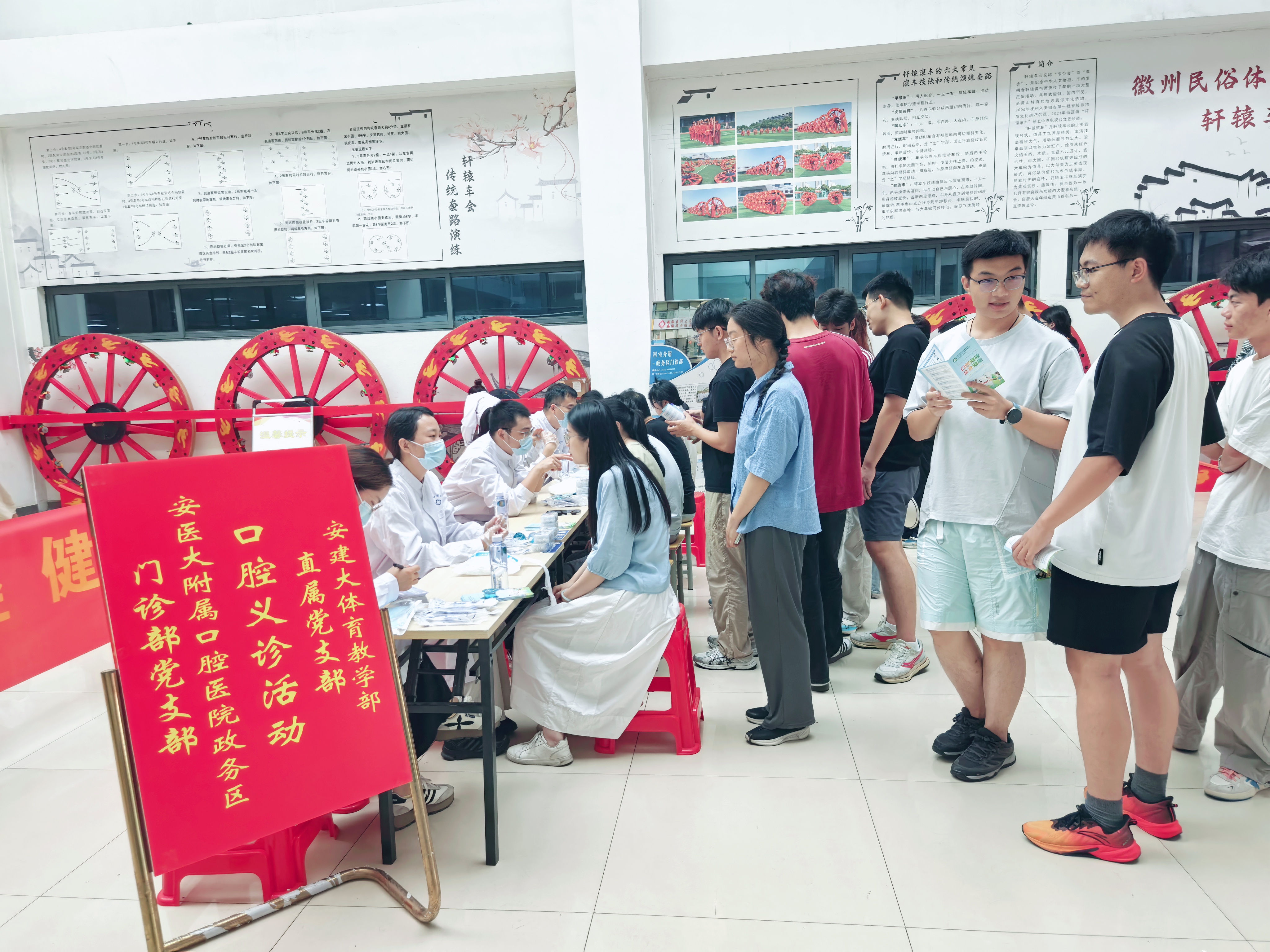 会议现场,徐飞与孙晖代表双方支部签订党建共建协议,标志着校院党建合作正式落地。协议签订后,义诊活动在体育馆指定区域拉开帷幕。安徽省口腔医院政务区门诊部的吴晓婷、何帆等主治医师,以及护士长张亚琼带领的医护团队,为前来咨询的师生提供口腔检查、龋齿防治、牙周健康指导等服务,耐心解答牙齿矫正、运动口腔防护等常见问题,并发放口腔健康宣传手册,累计服务师生近200人次。