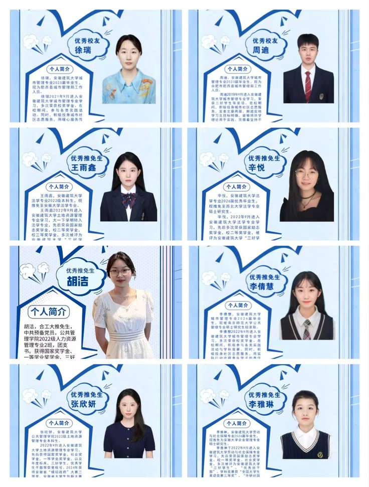 活动第三阶段,优秀校友及2026届优秀推免生结合自身经历分享经验。土地资源管理专业邀请本专业优秀学生张欣妍,分享学习生活经历与保研心得;城市管理专业邀请优秀校友周迪、徐瑞、李倩慧,分享专业课学习、考公考研经验,叮嘱新生珍惜大学时光;劳动与社会保障专业邀请22级优秀推免生李雅琳,从方向选择、课程学习、实践积累、心态调整四方面,分享学业规划与推免经验;人力资源管理专业邀请胡洁同学(现已推免至合肥工业大学),分享高效学习、科研竞赛参与及大学生涯规划的成长心得;法学专业邀请22级推免生王雨鑫、辛悦同学,讲解保研准备、学业积累要点与推免流程,传递正能量。