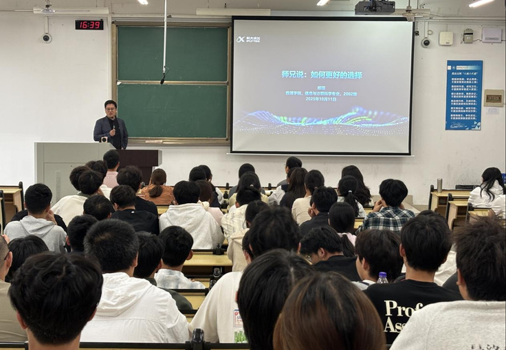 学院2002级信息专业优秀校友邢猛,现任科大讯飞智能汽车事业部北方区总经理,以“如何更好地选择”为核心做主题分享。他串联起从校园求学至职场深耕的成长脉络,围绕三个“关键选择”层层展开,为新生构建了清晰的发展指引框架。一是从课堂走向实践,锚定专业兴趣:他建议新生打破课本局限,主动运用Python、MATLAB 等工具将数学模型转化为实践成果,在实操中发掘并深化对专业的内在兴趣,实现理论与实践的深度衔接。二是从专业看向行业,把握时代机遇:以自身深耕人工智能领域的经历为引,点明数理学院各专业培养的“算法思维”与“数据处理能力”与行业核心技术人才需求高度适配;并结合科大讯飞等企业案例,具象化阐释了专业知识在产业场景中的应用价值与转化路径。三是从深耕拓展至突破,构建跨界能力:结合职场经验,他强调要以专业核心课程为基石,主动关注学科前沿、拓宽知识边界,通过跨领域学习实现能力的融合与突破,形成可持续的竞争力。