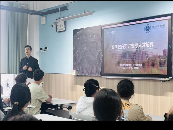 在结束“劳动教育第一课”后,“双创教育第一课”在徽学楼1501教室接续举行。聚焦“双创教育更好支撑人才培养”这一核心主题。蔡弘从顶层设计入手,系统阐释了学院双创工作的目标与原则,并详细介绍了学校支持学生项目的全方位政策与服务保障体系,向新生们传递了学院“全力支持、全程服务”的明确信号与坚定决心。