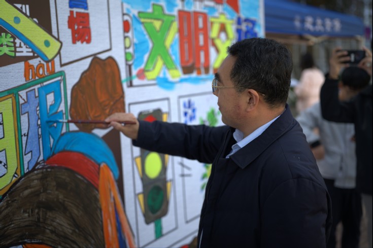 校领导认真听取主办方相关负责人对活动形式的介绍,同时对同学们将艺术创意与安全主题相结合的能力表示赞赏,对这种寓教于乐的安全教育新模式给予了高度评价。在热闹的“安全知识涂鸦区”,蔡国军欣然拿起画笔,与同学们一道在长卷上挥毫创作,绘制出寓意平安的图案,以实际行动诠释了“师生同心、共筑安全”的理念。